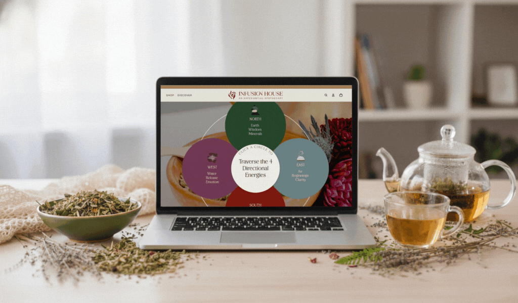 When Beth came to us, Infusion House didn’t exist. What she had was a powerful vision rooted in lineage, land, and a reverent approach to herbalism, but no name, no structure, and no cohesive way to bring it into the world. We partnered with her from the very beginning, naming the brand and helping shape the foundational ethos that guides every part of the business. From the intentional shopping experience built around the Four Directions, we created an entire ecosystem that invites customers into healing on their own terms. We crafted the full visual identity, designed and developed a custom Shopify site, led a deeply aligned brand photoshoot, and produced clear, resonant messaging that captures the sacred nature of Beth’s work without watering it down. We also created product packaging that looks like art and feels like medicine. The result is a brand that honors the wisdom of tradition while making space for modern bodies and souls in transition, which is a living, breathing expression of Beth’s original vision, brought fully into form.